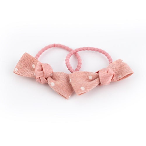 Rolig att göra tofsar eller flätor med som avslutning. Levereras 2 st i en förpackning. Här i en härlig rosa färg med vita prickar med detalj av en rosett.