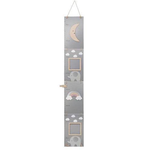 Måttstock i vitt och gråttt med söta elefanter. En söt mätsticka i trä att hänga på väggen i barnrummet. Måttstocken har plats för 2 foton och mäter barnets längd mellan 75-155 cm. En liten träklämma ingår där du kan fästa klämman varje gång du mätt barnets längd. Utöver att dokumentera barnets längd och utveckling är det också en dekorativ inredningsdetalj till barnrummet.
