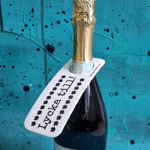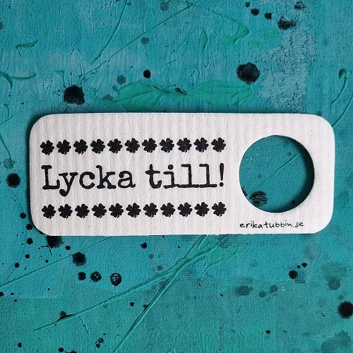 Lycka till med nya jobbet, lycka till med tentan, lycka till med...ja vad som passar. Häng om halsen på flaskan, blombuketten eller presenten som ska ges bort. När kortet är givet kan mottagaren använda den som minitrasa eller droppstop för dyrbara droppar! Kul kort med extra praktisk nytta!