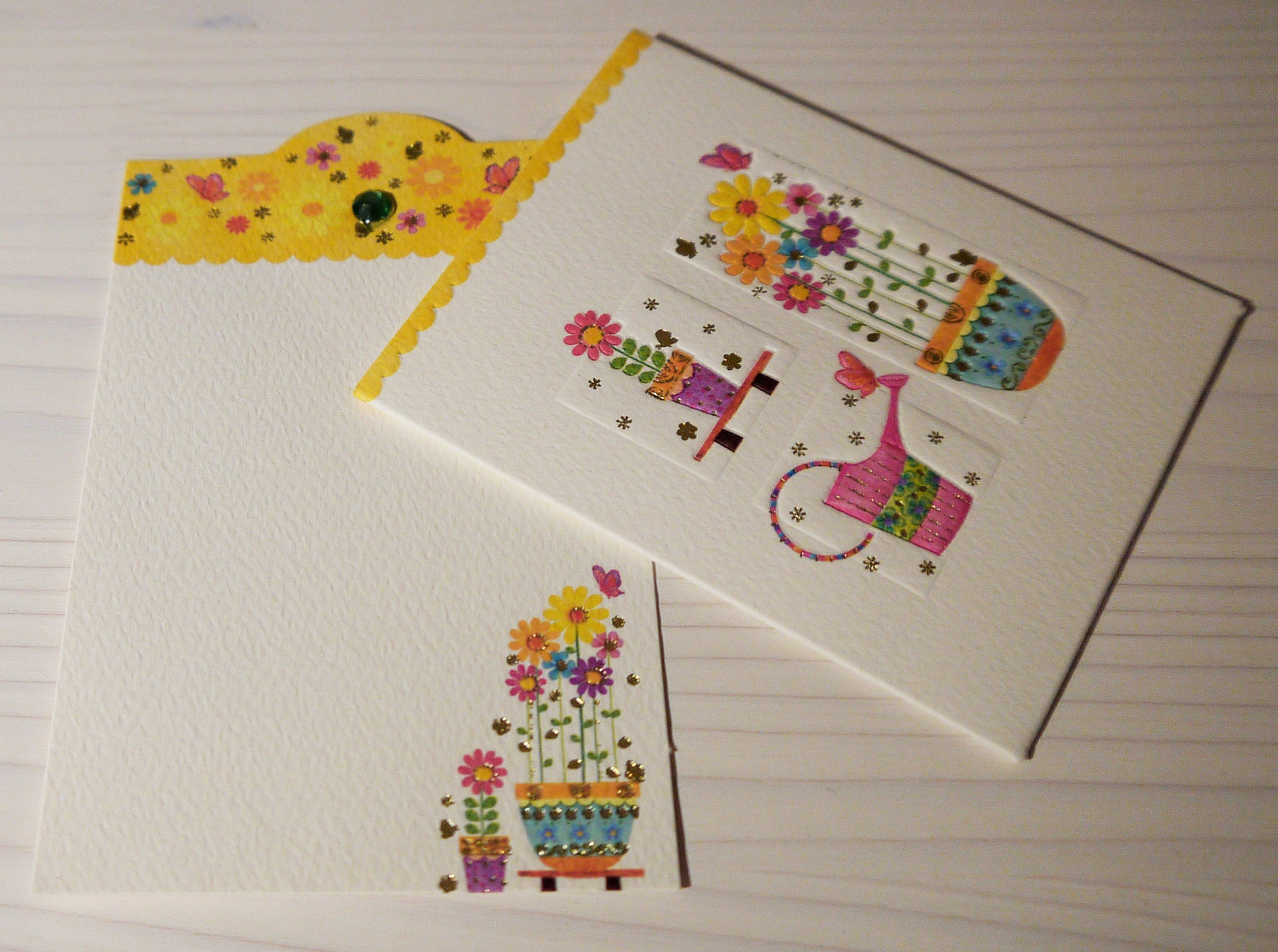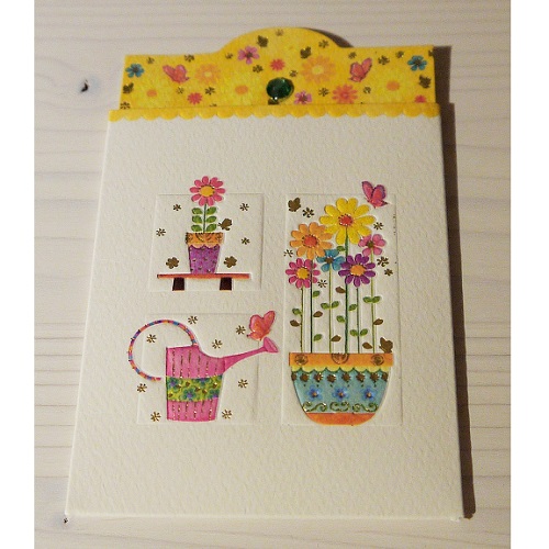 Söta kort där du drar ut själva kortet du skriver på ur ett fodral. Fina blommor , vattenkanna och färgerna går i gula nyanser. Fint som dop eller födelsedagskort till barn. Storlek ca 10 x 6,5 cm.