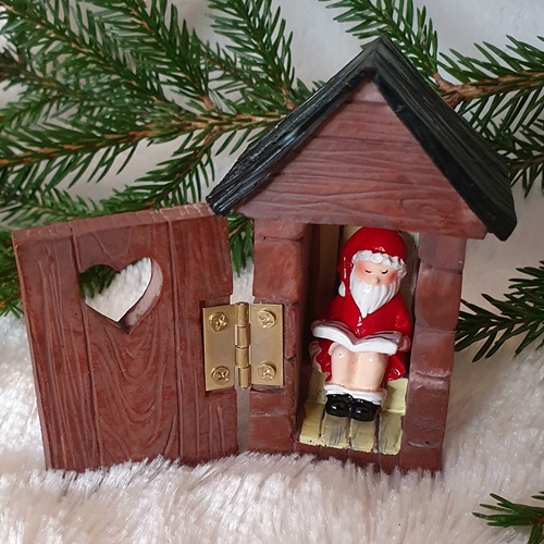 En klassiker blir aldrig fel! I flera år har barnen tyckt det varit jättekul att öppna dörren till dasset för att se vem som gömmer sig där inne. Denna gång var det själva tomten som behövde gå på toa! En härlig och rolig juldetalj till julhemmet! Svensk design av Viktoria Hagfeldt. Kan skilja sig åt då de är handmålade.
