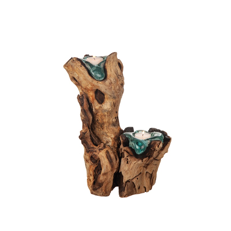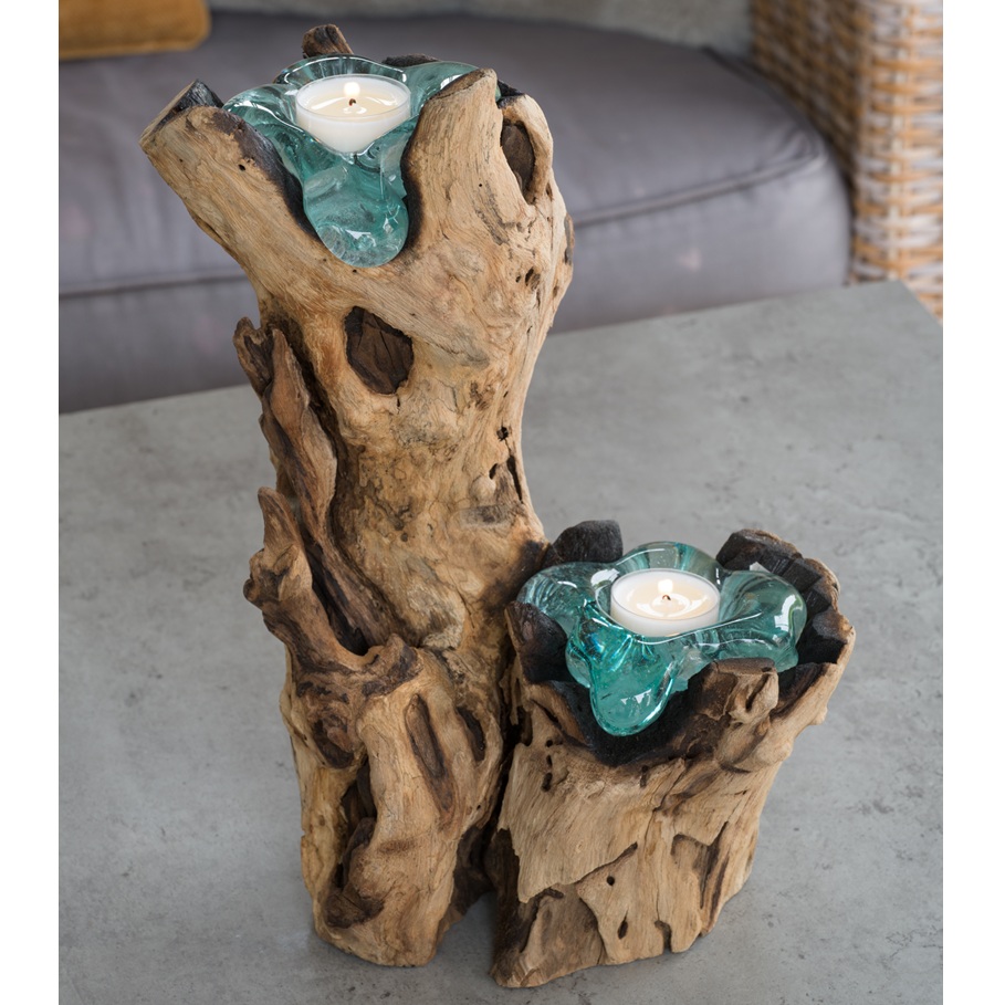 Låt naturen lysa upp ditt hem med denna handgjorda ljuslykta i rotträ. Varje lykta är ett unikt konstverk där det vackert formade träet möter smält glas som formar sig efter naturens egen design. Placera den på bordet, i hallen eller i vardagsrummet för att skapa en varm och harmonisk atmosfär. En perfekt detalj för dig som älskar naturlig inredning och hållbart hantverk.