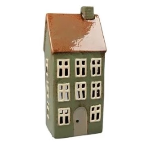 Gröndal är ett handgjort keramikhus i en mjuk grön ton som skiftar mot petrol, vilket ger en frisk och naturlig känsla. Det släta, bruna taket skapar en varm kontrast och en stilren, enkel siluett. Perfekt att lysa upp med värmeljus som sprider ett mjukt, inbjudande sken genom fönstren.