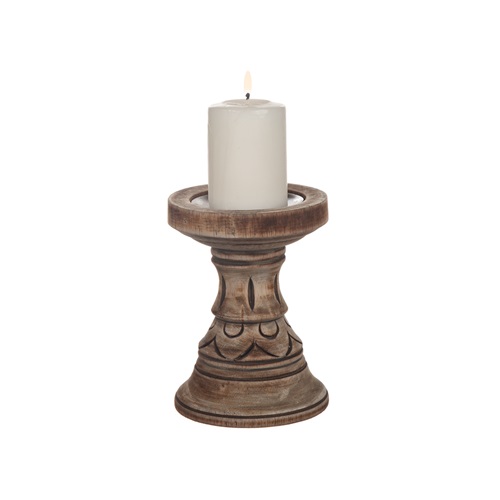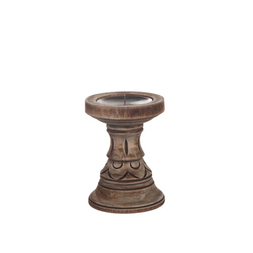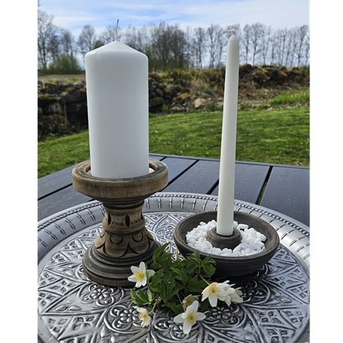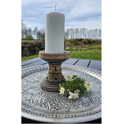 En vacker handgjord ljusstake i svarvad trä. Ovanpå ljusstaken finner man en platt plåtdel. Dock ska man aldrig lämna ljus utan uppmärksamhet!