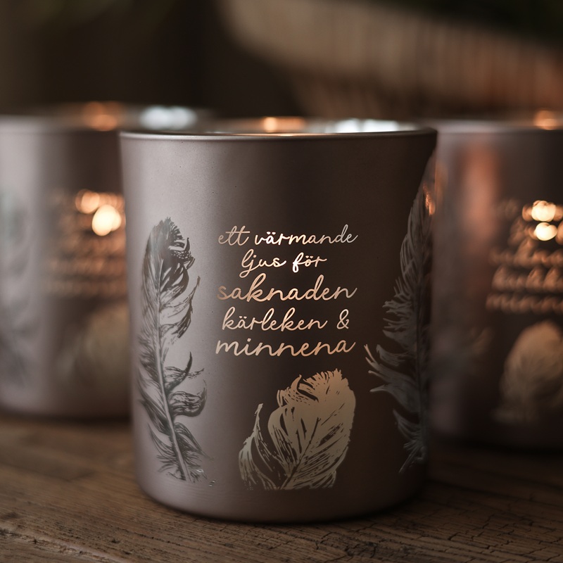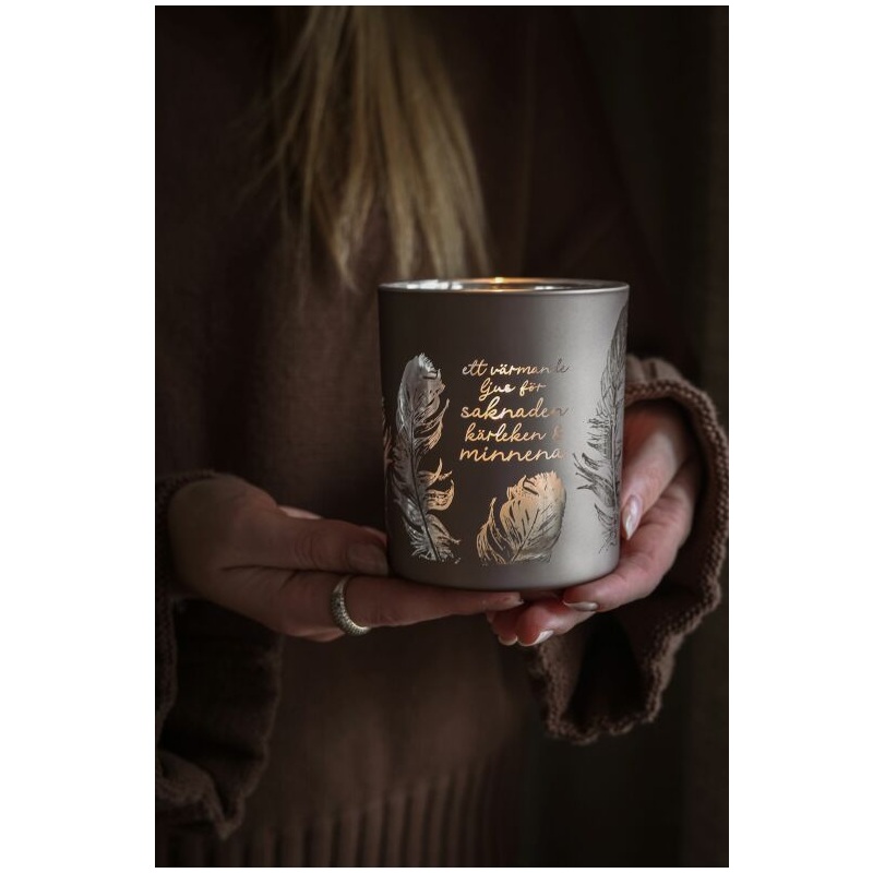 Skapa en rogivande stund i vardagen med denna beigegrå lykta från Majas Cottage. Den lena, jordnära tonen tillsammans med det skimrande budskapet – "Ett värmande ljus för saknaden, kärleken & minnena" – gör lyktan till en vacker påminnelse om närhet och omtanke. Perfekt som minnesgåva, present eller ett mjukt ljus i ditt hem där stillhet får ta plats.