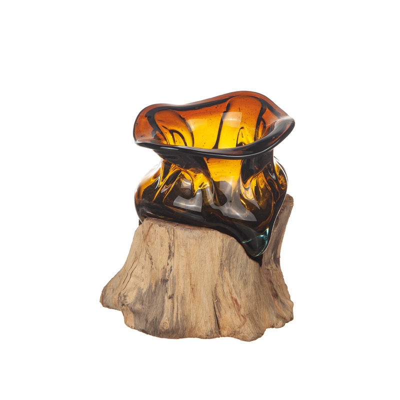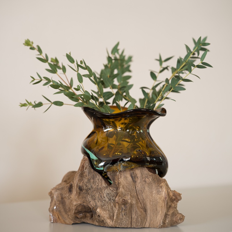 En handgjord glasvas där glaset långsamt formats över en naturlig trädrot — varje vas är unik. Kombinationen av glasets organiska form och den rustika roten skapar en dekor med både själ och karaktär.