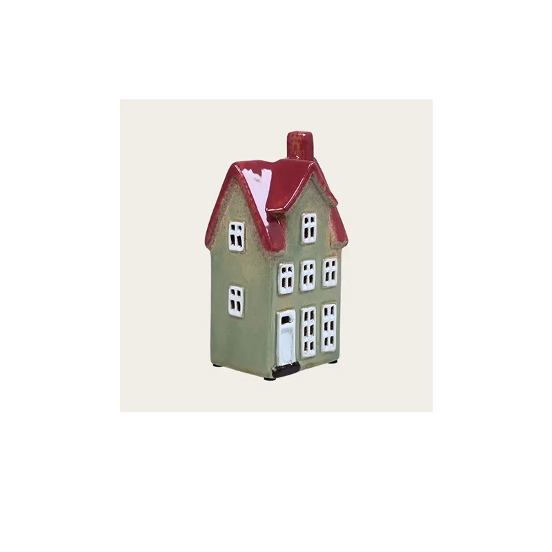 Skapa en stämningsfull och hemtrevlig känsla med detta vackra keramikhus i grönt med rött tak. Huset har en klassisk design med fina detaljer och mjukt glaserad yta som reflekterar ljuset på ett behagligt sätt. Placera det tillsammans med andra ljushus för att bygga upp en liten julby, eller låt det stå för sig självt som en varm inredningsdetalj i fönstret, på hyllan eller i adventslandskapet. Ett tidlöst pynt som sprider både charm och julkänsla i hemmet!