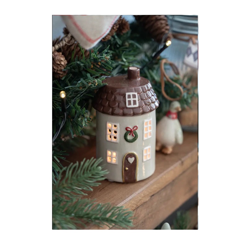 Förvandla ditt hem till ett charmigt vinterparadis med detta fina keramikhus. Med sin kompakta höjd på 11 cm är det perfekt att ställa på fönsterbrädan, i en hylla eller mitt i ett vinterlandskap med mossa, granris och värmeljus. Den varma glasyren och det diskreta ljusspelet genom fönstren skapar en hemtrevlig atmosfär och får julstämningen att kännas på riktigt. Kombinera med andra hus i serien för att bygga din egen lilla julby – eller låt det stå själv som ett stilrent dekorationsinslag i ditt vinterhem.