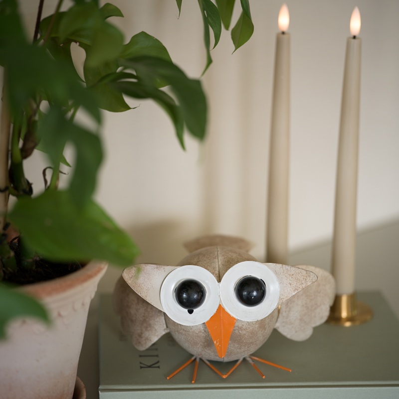 Denna vackra uggla i hamrad plåt är ett unikt hantverk som förenar charm och elegans. Varje detalj är varsamt handgjord, vilket gör varje uggla helt unik i sitt uttryck. Färgen ger en mjuk och harmonisk ton som passar in i både moderna och lantliga hem.